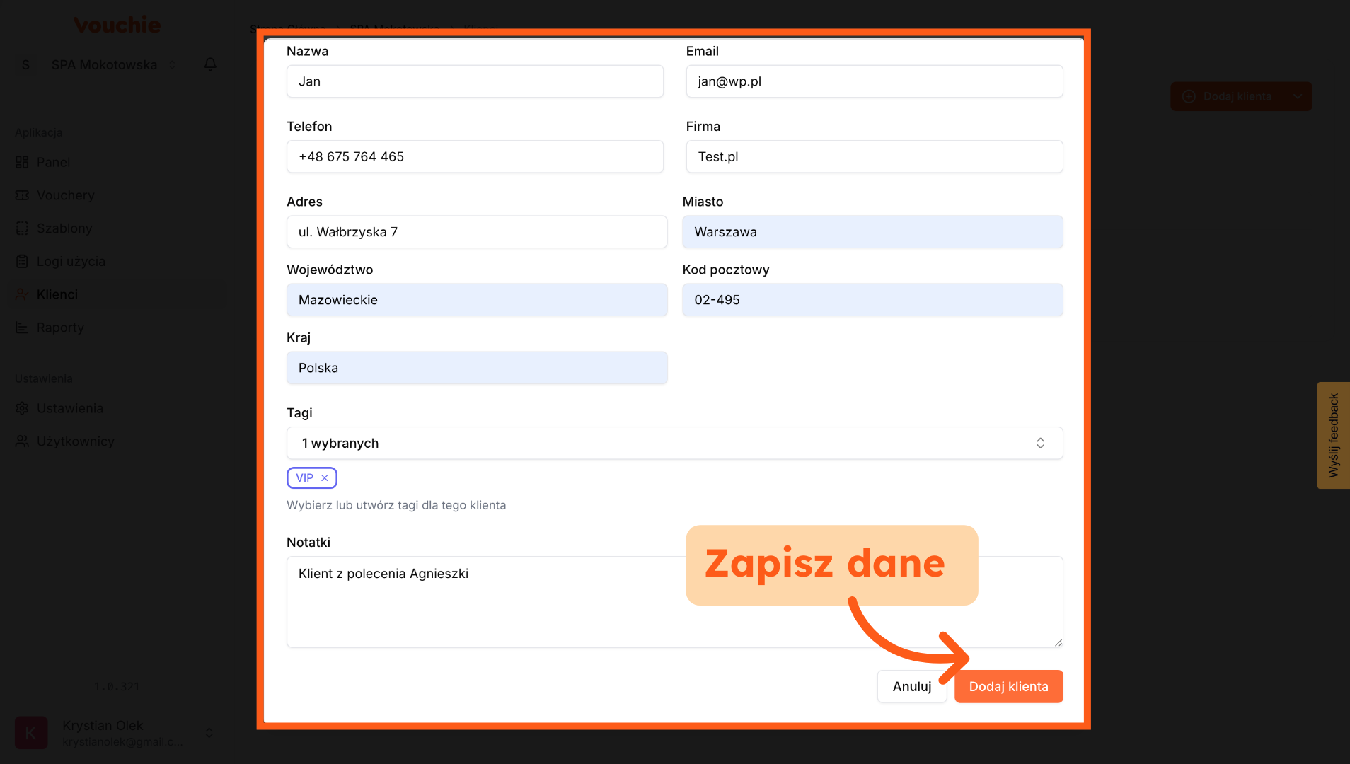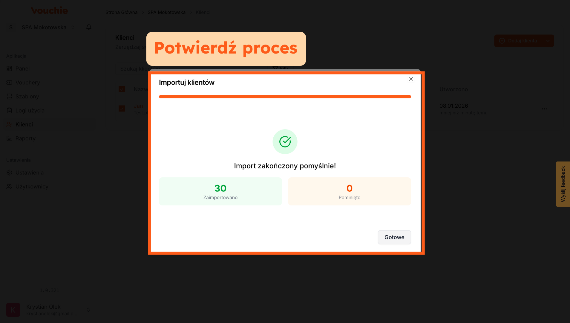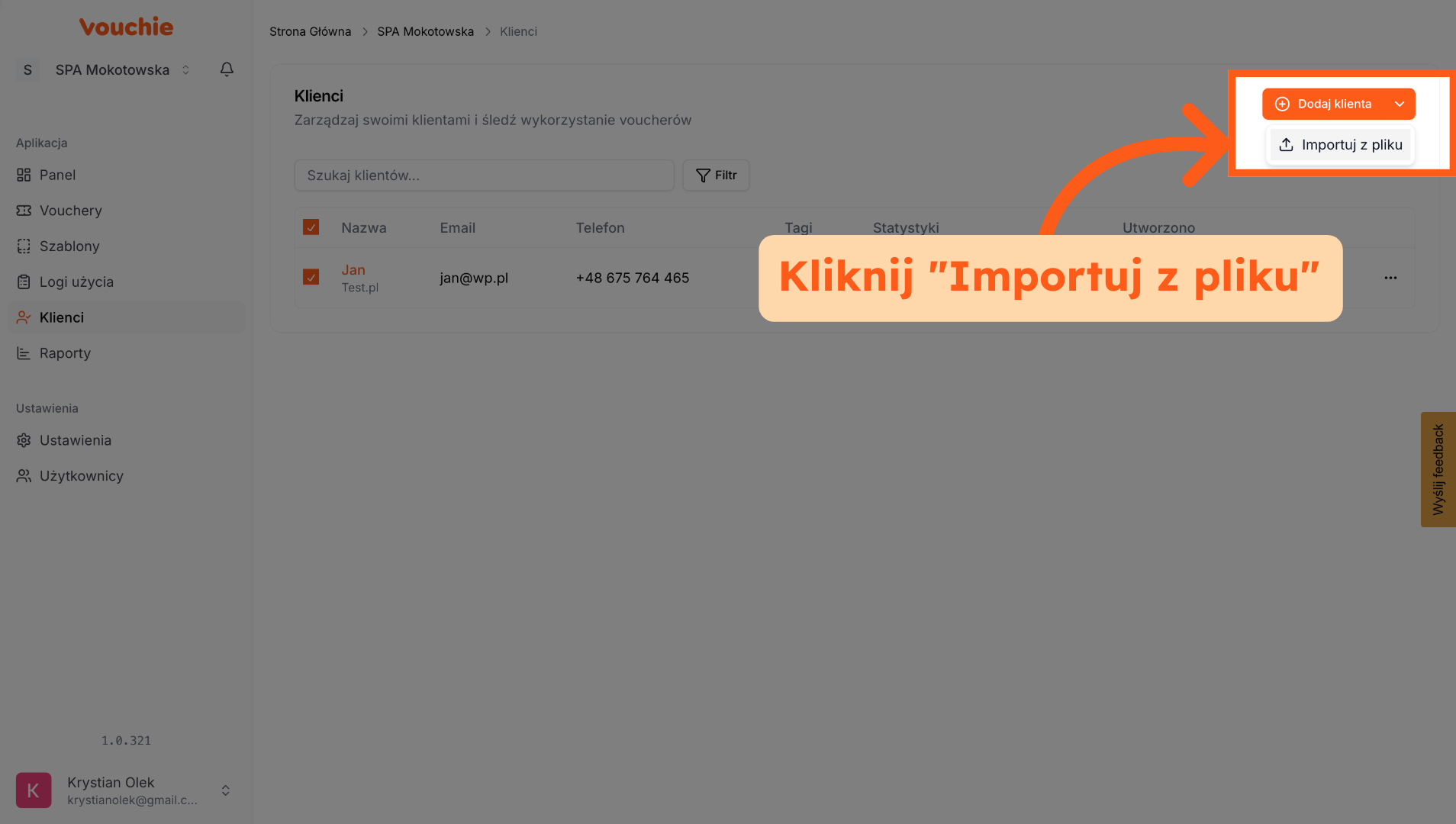 Wykonano dodanie pojedynczego klienta oraz masowy import klientów z pliku CSV w aplikacji Vouchie. Teraz możesz zarządzać klientami i monitorować wykorzystanie voucherów, korzystając z dostępnych funkcji systemu.
