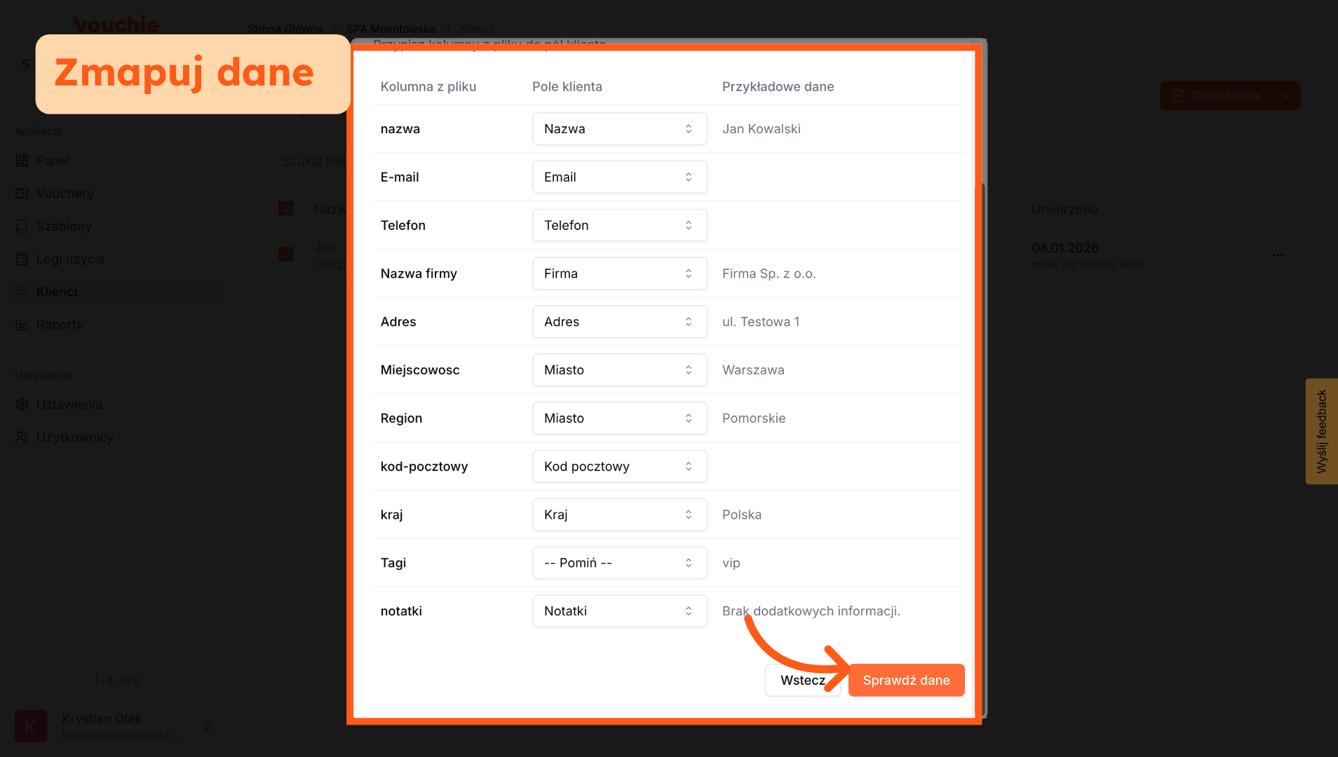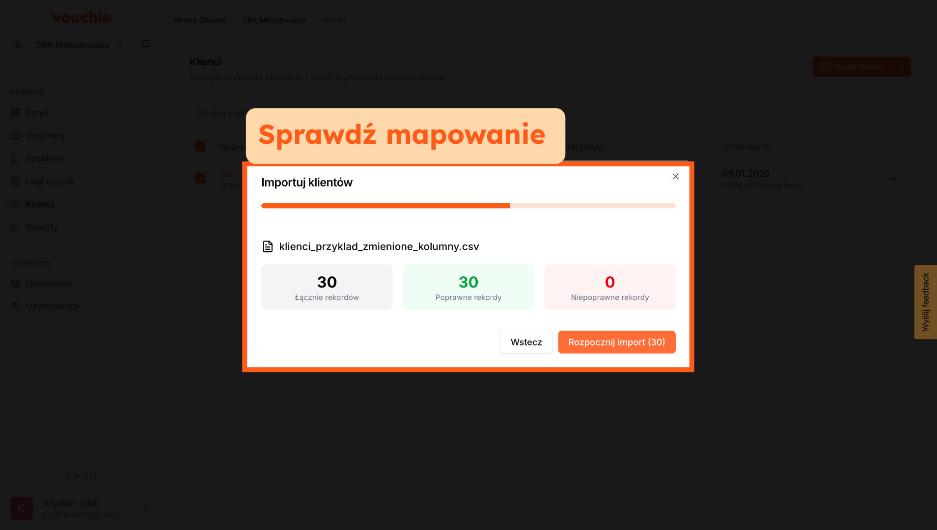 Na czym to polega? Po lewej stronie widzisz nazwy kolumn ze pliku (np. "Email"), a po prawej wybierasz odpowiadające im pola w Vouchie (np. "E-mail").