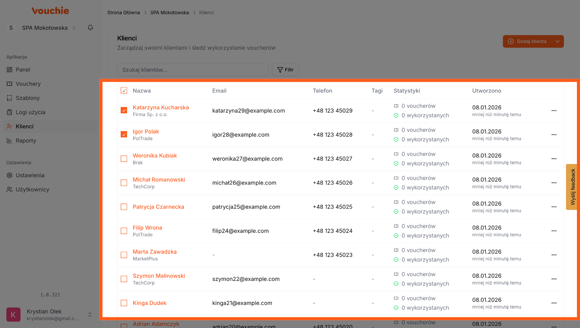 Po pomyślnym imporcie i kliknięciu "Gotowe", zostaniesz przeniesiony do głównego widoku Listy Klientów. Twoja nowa baza jest już widoczna, w pełni przeszukiwalna i gotowa do przypisywania voucherów. Każdy rekord zawiera zdefiniowane wcześniej dane kontaktowe, tagi oraz notatki.