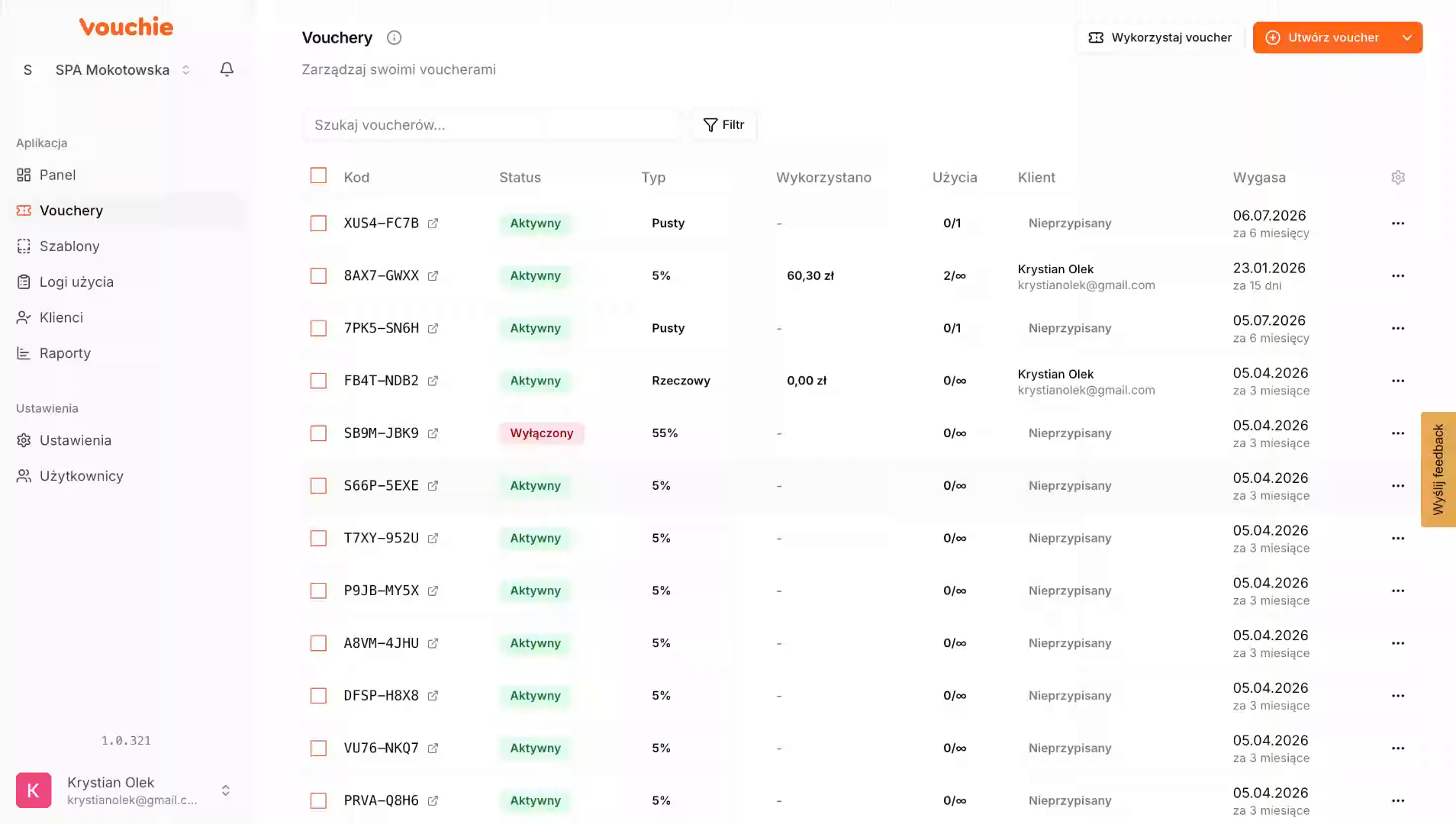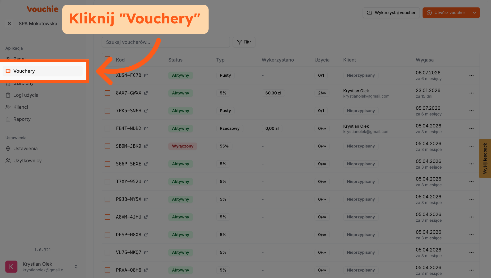 Kliknij zakładkę "Vouchery", aby wyświetlić listę dostępnych voucherów w aplikacji Vouchie.