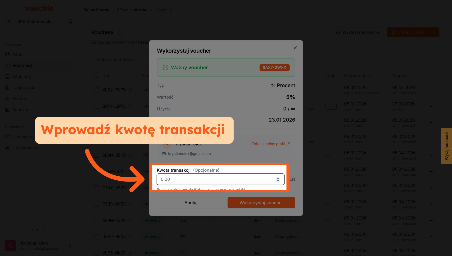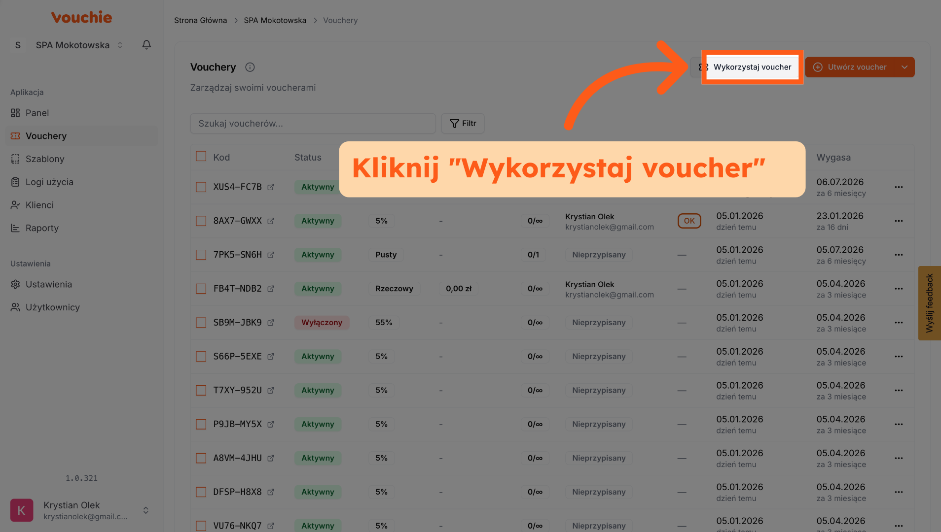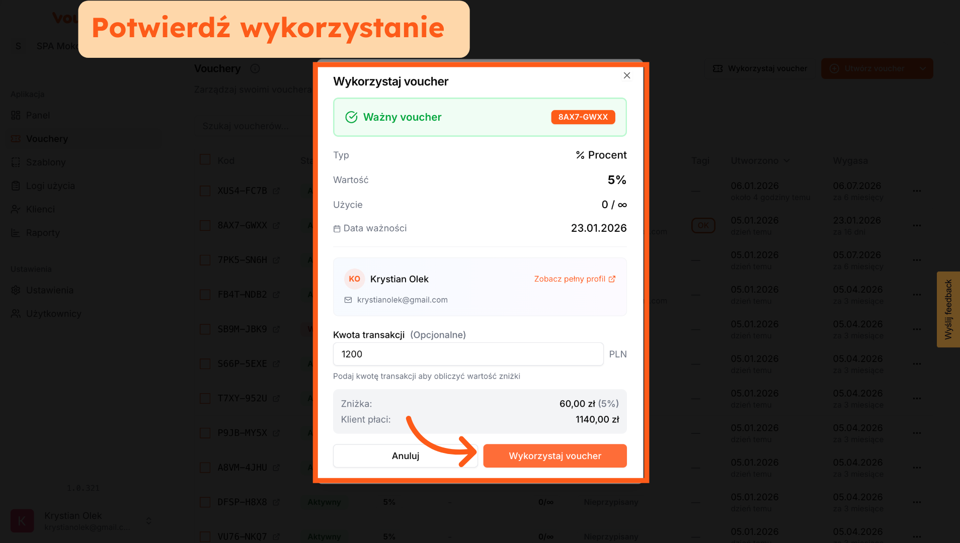 5. Wykorzystaj Voucher z widoku sekcji Vouchery