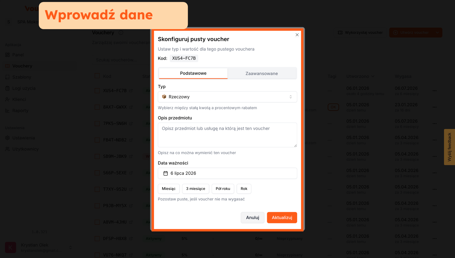 Musisz najpierw uzupełnić Typ i Wartość vouchera, aby móc go wykorzystać.