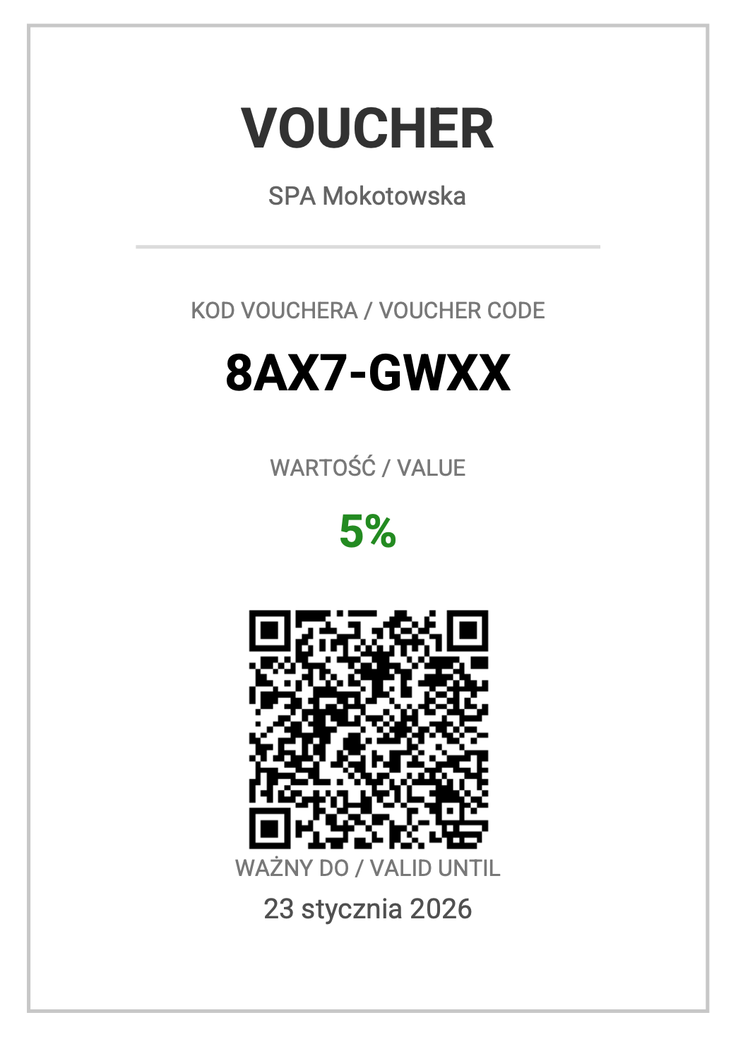 2. Elegancki Voucher PDF (Do druku): Do wiadomości dołączony jest podgląd vouchera w formacie przypominającym klasyczny, drukowany bon. Zawiera on pełne informacje brandingowe (np. "SPA Mokotowska"), duży kod QR do skanowania oraz kod alfanumeryczny. To idealna opcja dla klientów, którzy wolą fizyczną formę prezentu.