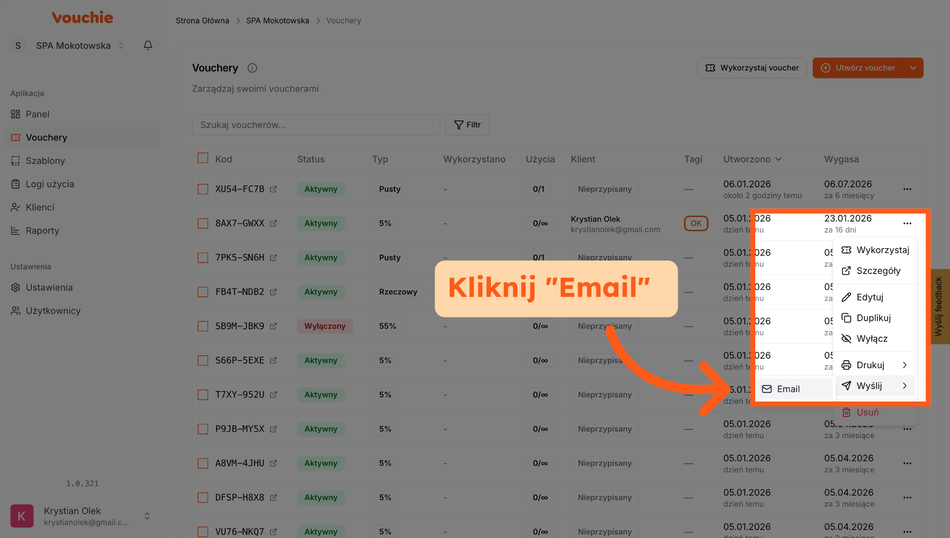 Na Liście Voucherów odszukaj ten, który chcesz wysłać. Kliknij menu akcji (trzy kropki) i wybierz opcję "Wyślij e-mail".