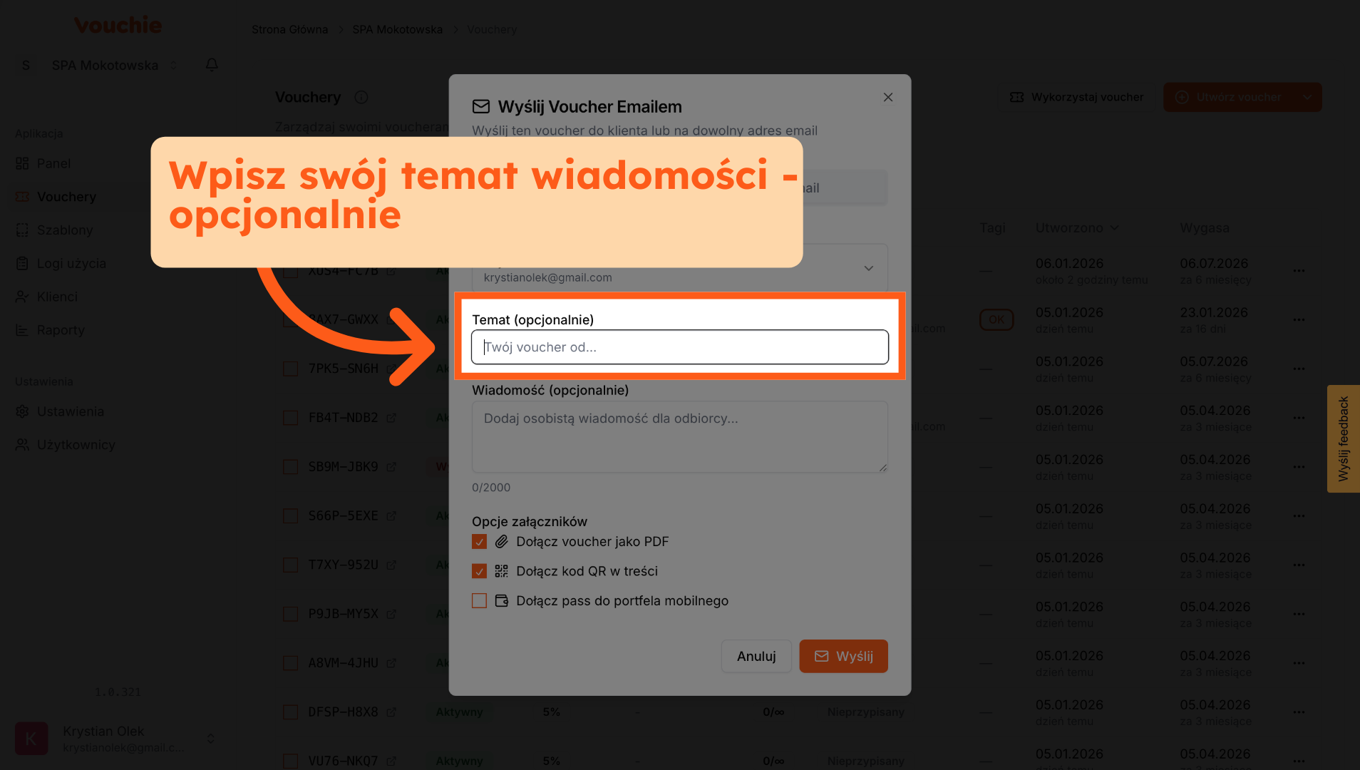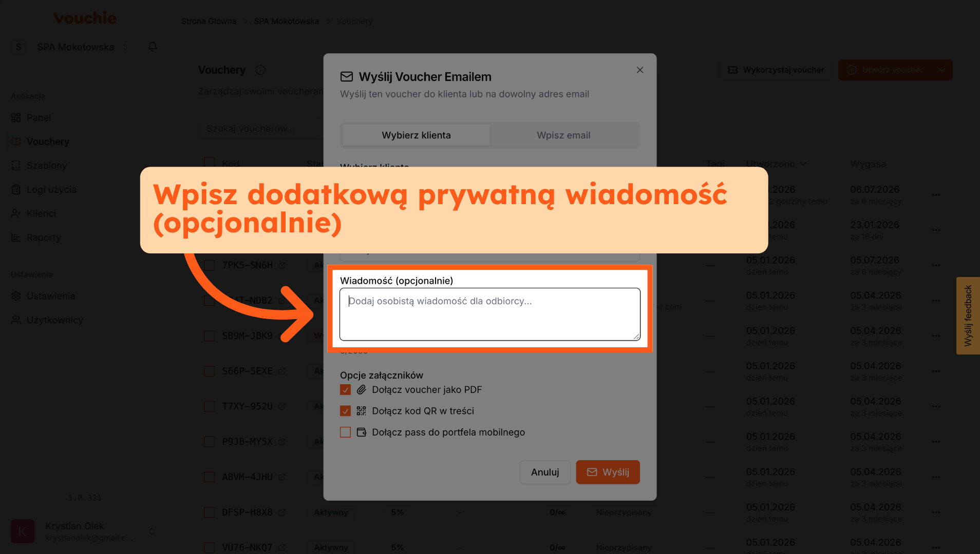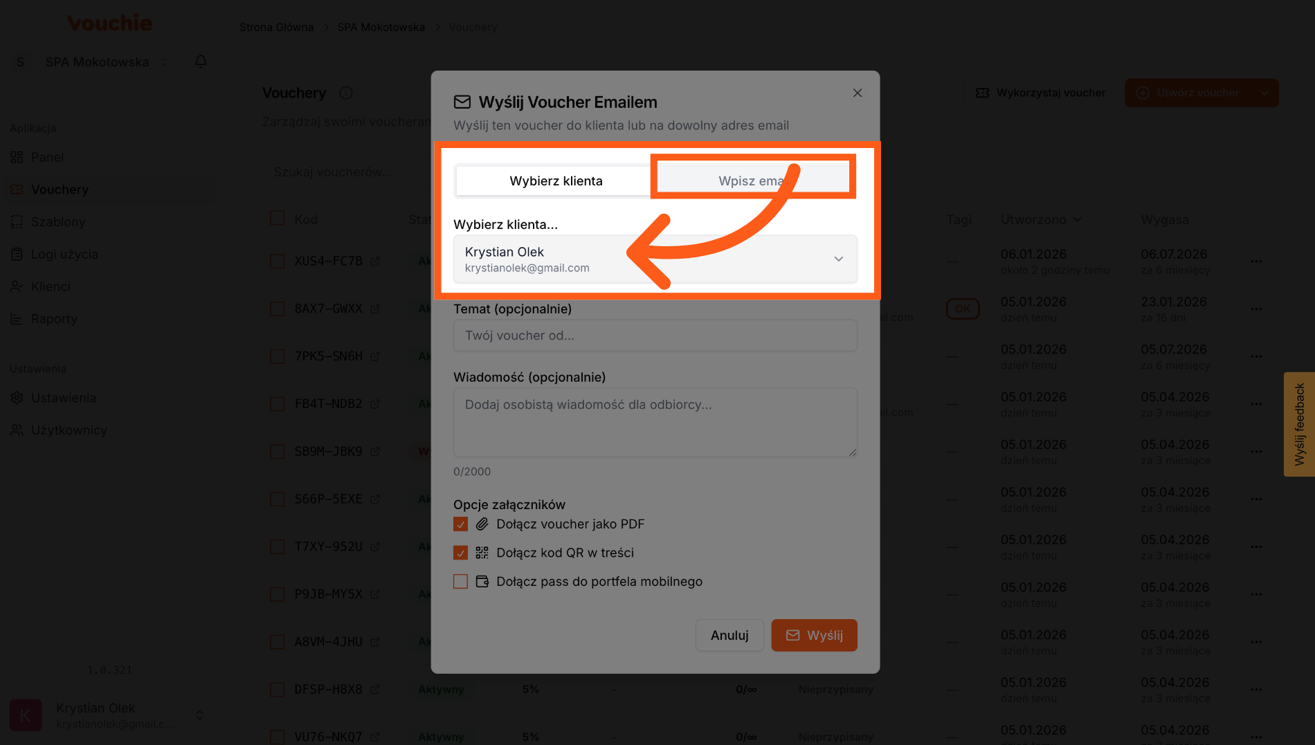 A. Voucher Przypisany do Klienta: Jeśli podczas tworzenia vouchera przypisałeś go do konkretnej osoby z bazy, system automatycznie uzupełni pole adresu e-mail. Nie musisz go szukać ani wpisywać ręcznie – to zabezpieczenie gwarantuje, że kod trafi do właściwej osoby.