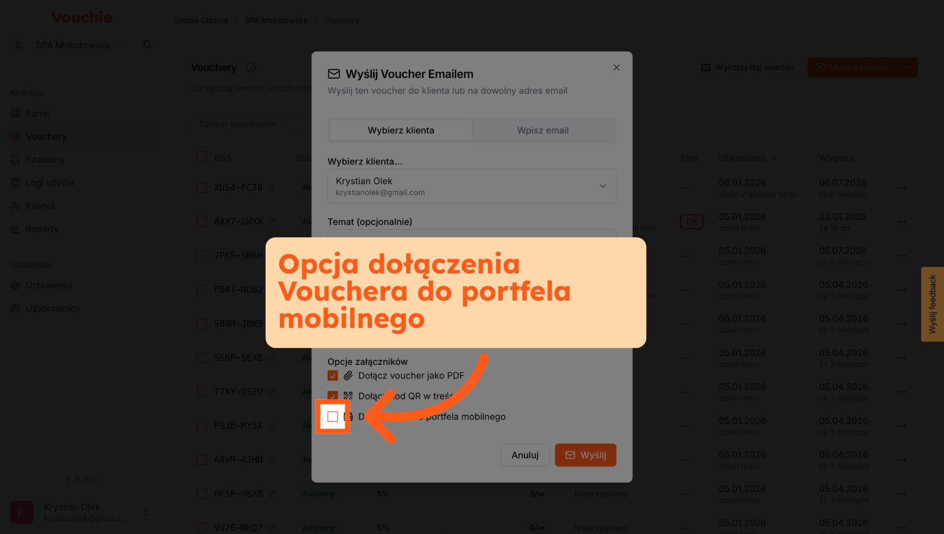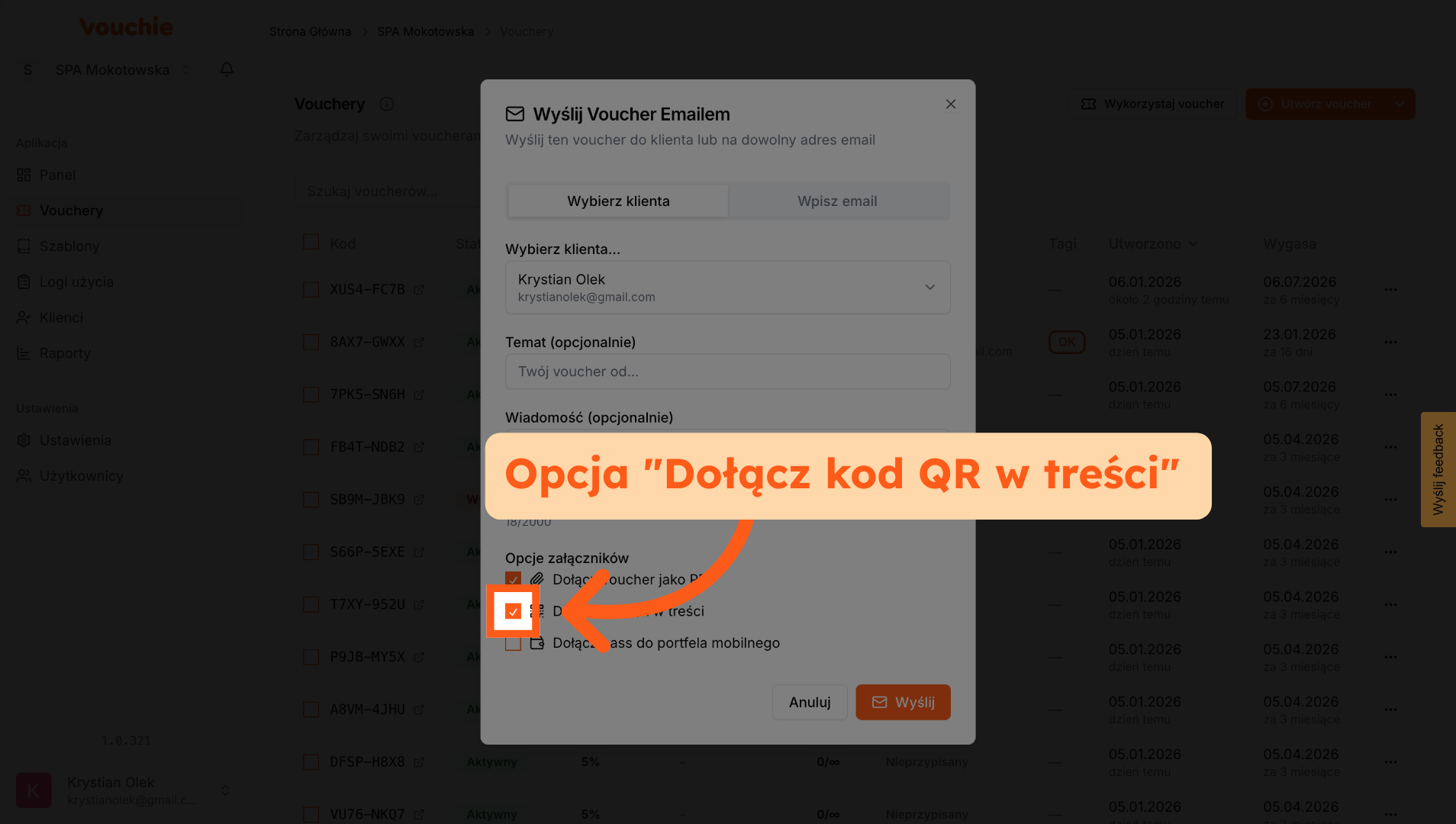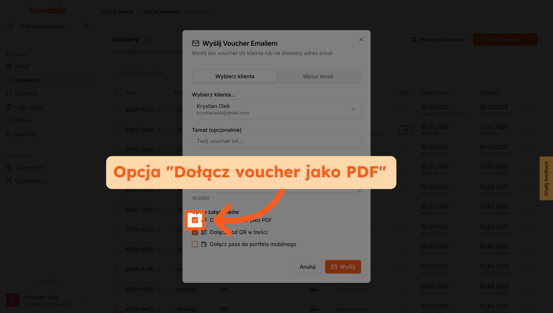 A. Voucher Przypisany do Klienta: Jeśli podczas tworzenia vouchera przypisałeś go do konkretnej osoby z bazy, system automatycznie uzupełni pole adresu e-mail. Nie musisz go szukać ani wpisywać ręcznie – to zabezpieczenie gwarantuje, że kod trafi do właściwej osoby.