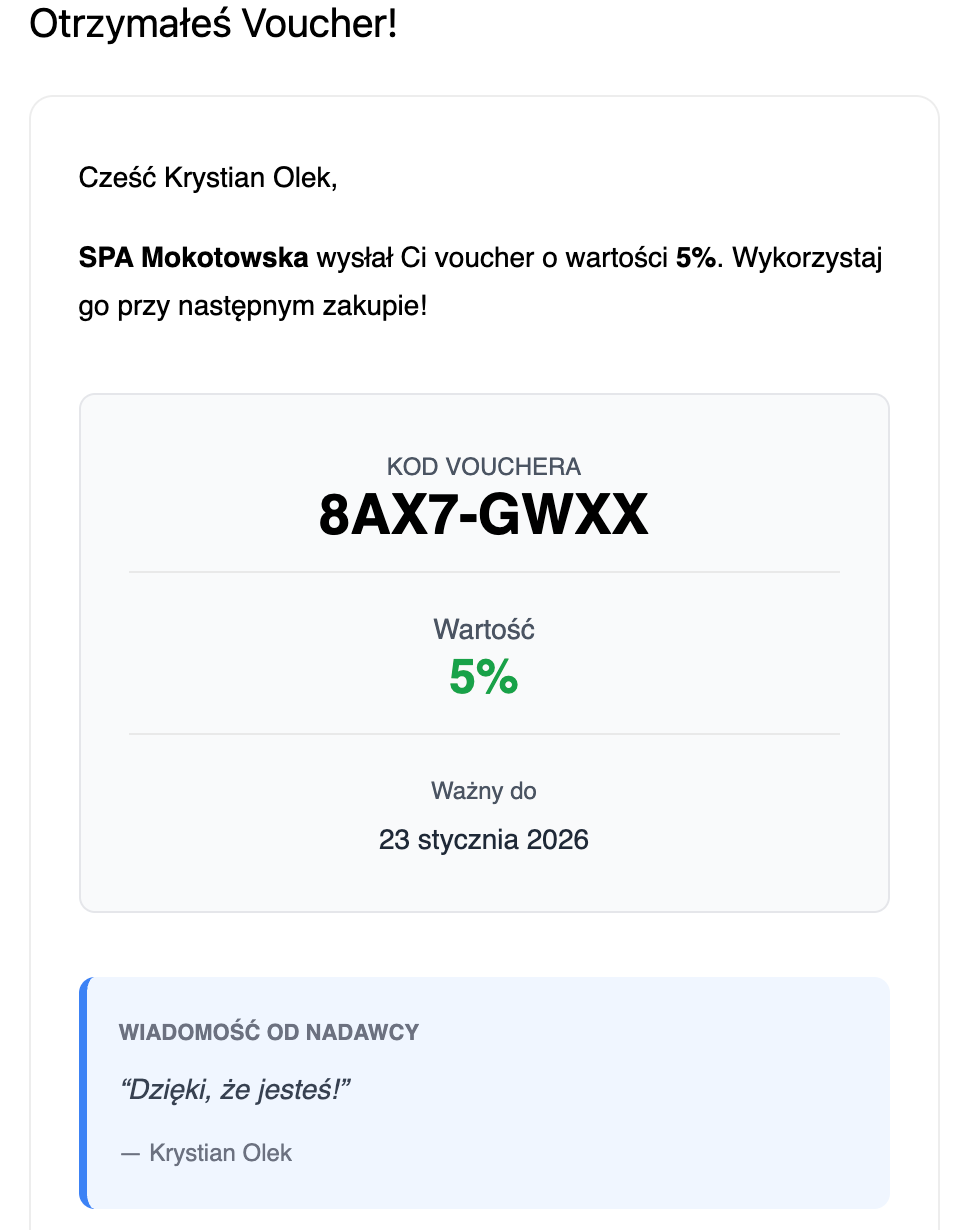 - Czytelna Wiadomość E-mail: Klient otrzymuje estetyczny e-mail z wyraźnym nagłówkiem (np. "Otrzymałeś Voucher!"), nazwą Twojej firmy, wartością zniżki (np. 5%) oraz co najważniejsze – dużym, czytelnym Kodem Vouchera i datą ważności. Twoja spersonalizowana wiadomość pojawia się w sekcji "Wiadomość od nadawcy".