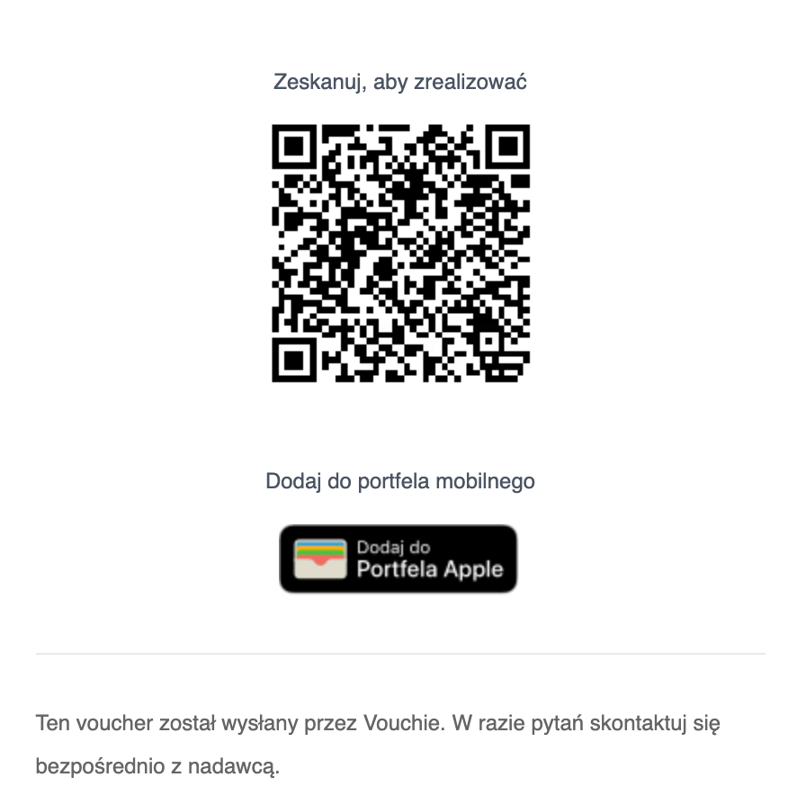 Dodania vouchera do portfela cyfrowego jednym kliknięciem przycisku "Dodaj do Portfela Apple" (Apple Wallet). Dzięki temu voucher będzie zawsze pod ręką w telefonie klienta, a powiadomienia przypomną mu o dacie wygaśnięcia.