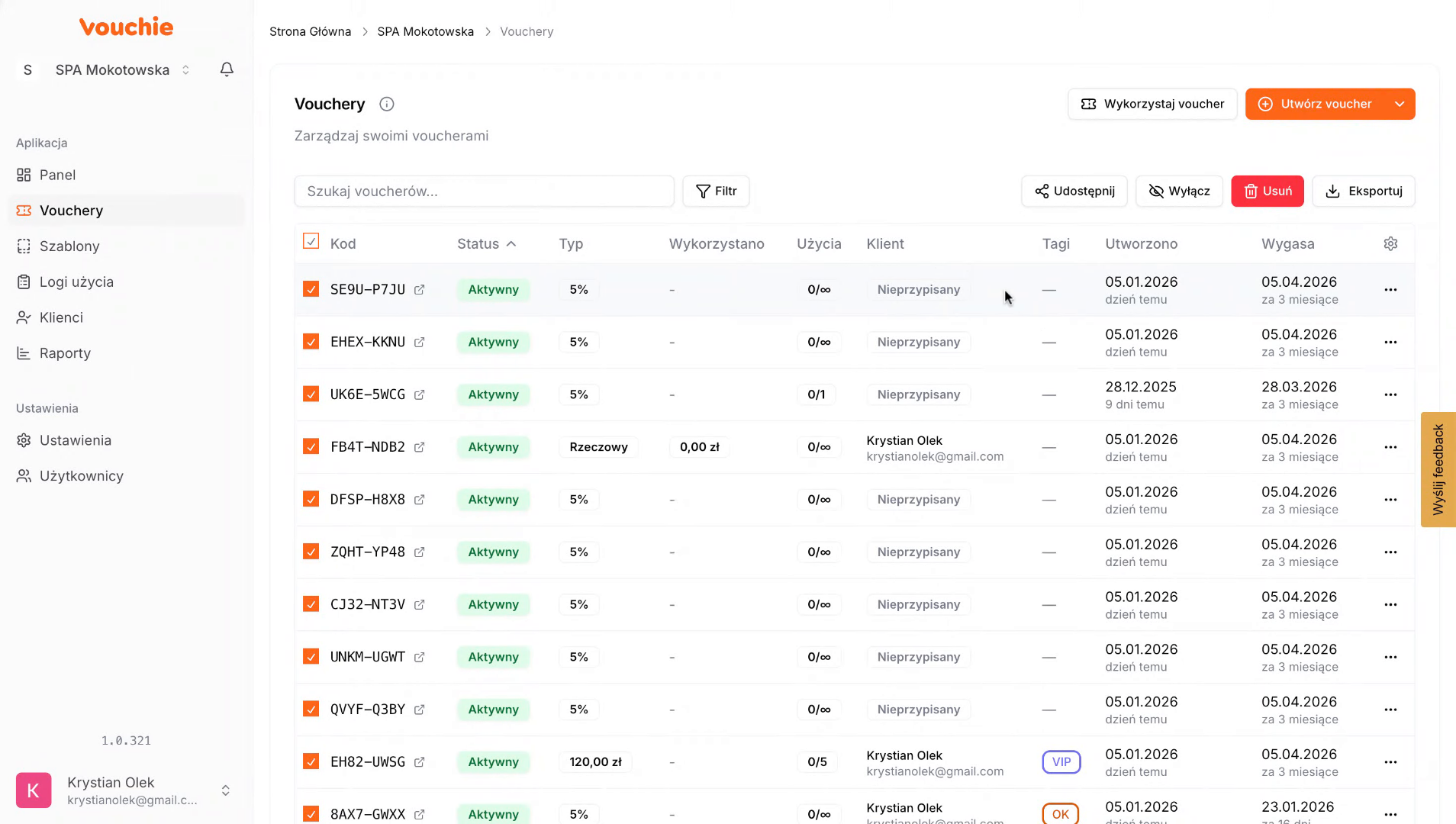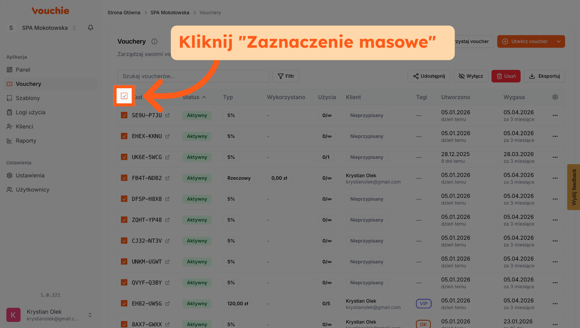 7. Wybierz wszystkie vouchery z listy
