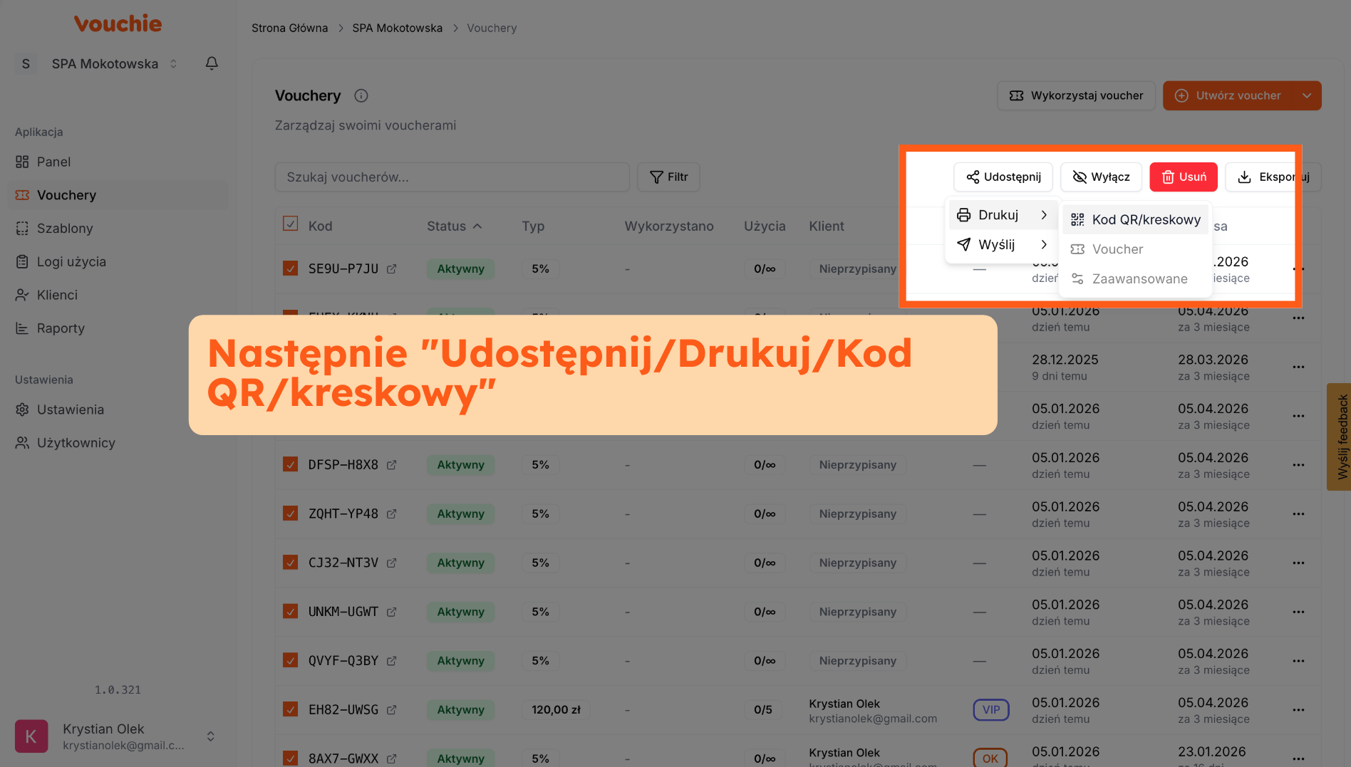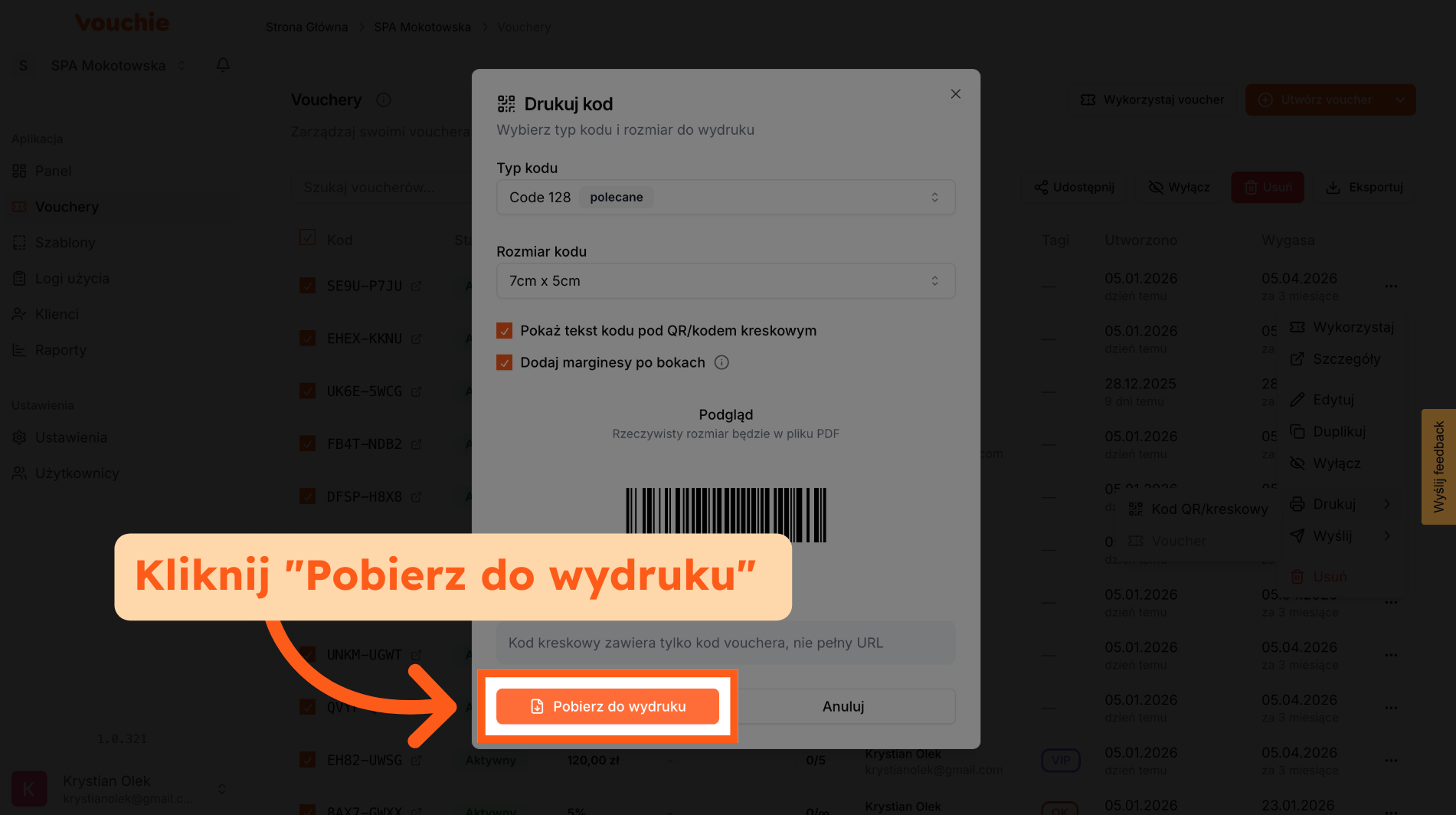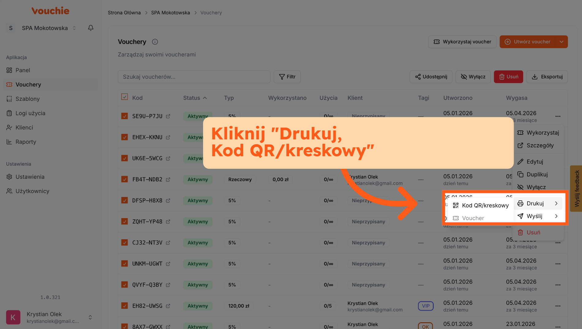- Ścieżka A: Z poziomu listy głównej Na głównej liście voucherów rozwiń menu akcji (trzy kropki) przy wybranym kodzie i wybierz opcję drukowania.