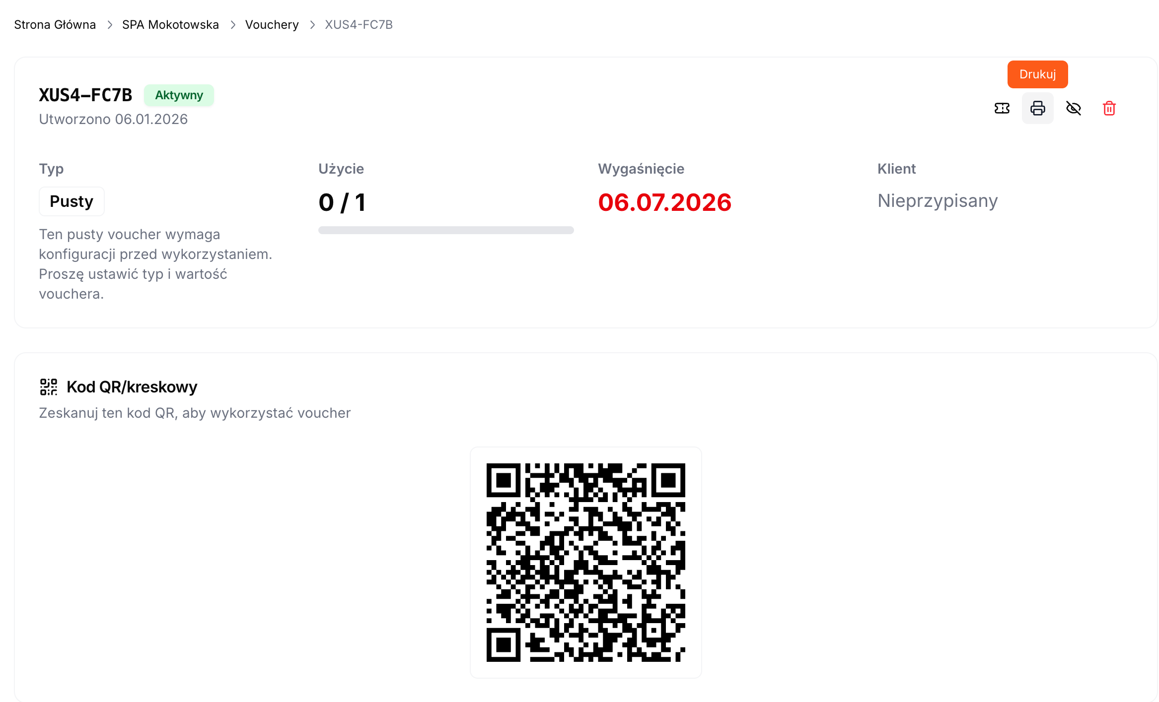 Kliknij ponownie Kod QR/kreskowy, aby zweryfikować ustawienia kodów na voucherach.