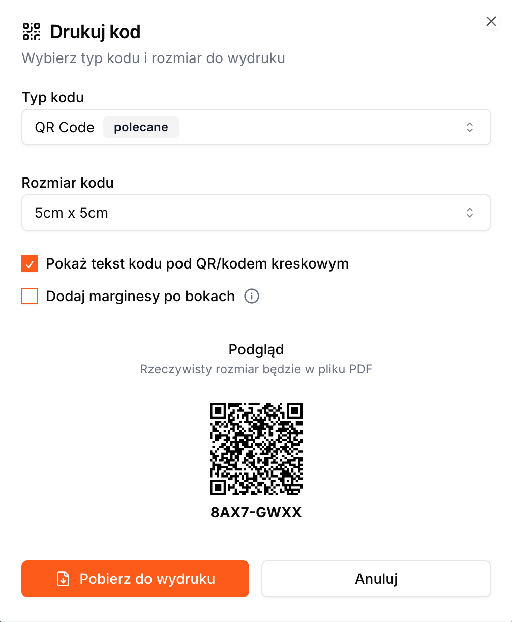 Proces obejmuje konfigurację kodów QR, marginesów oraz pobieranie gotowych plików do wydruku. System umożliwia błyskawiczne przekształcenie cyfrowych kodów w fizyczne wydruki. Funkcja ta obsługuje dwa główne scenariusze: wydruk pojedynczy (np. "od ręki" przy recepcji) oraz masowy (np. przygotowanie serii na event).